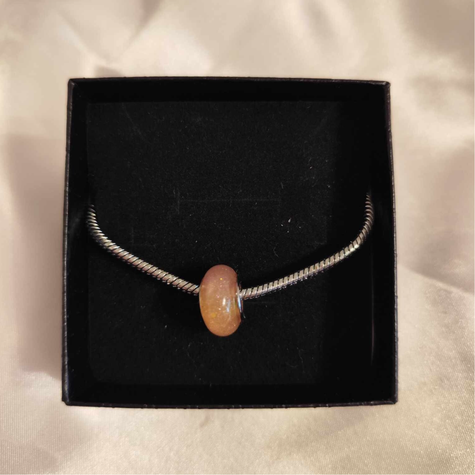 Ein schönes silbernes Armband mit einem Karabiner als Verschluss. Die Perle besteht aus Epoxy und ist einem schönen Pfirsich Orange. Die Armkette passt für ein Hangelenk von 16cm bis 20cm Umfang.