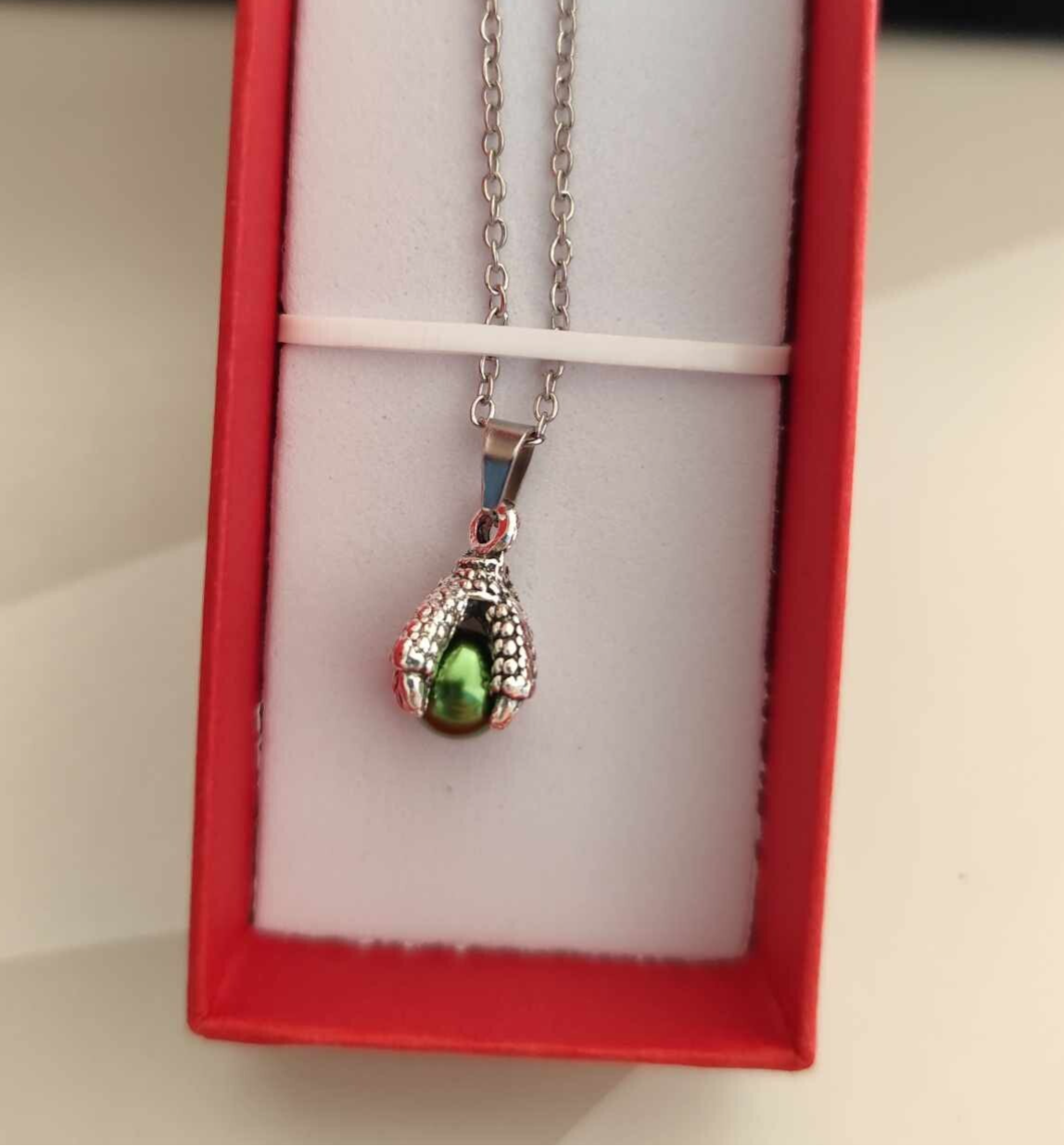 Eine Silberne Halskette mit einem Anhänger einer Drachenkralle. Die Kette hat eine Länge von 45cm.