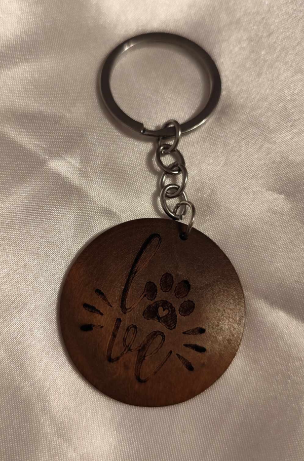 Schlüsselanhänger aus Holz. Dieser Schlüsselanhänger hat eine beidseitige Laserung.