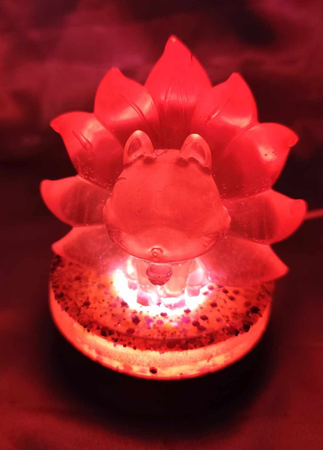 Ein süsser Neunschwänziger Fuchs als Lampe aus Epoxisharz auf einem LED Holzsockel. Die Lampe hat ein angenehmes warmes Licht.