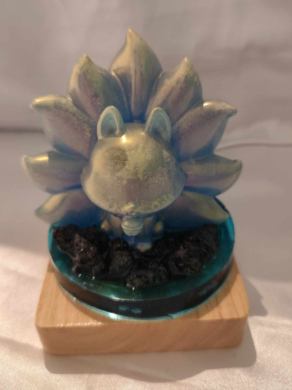 Ein süsser Neunschwänziger Fuchs als Lampe aus Epoxisharz auf einem LED Holzsockel. Die Lampe hat ein angenehmes warmes Licht das mit einem Dimmer eingestellt werden kann.