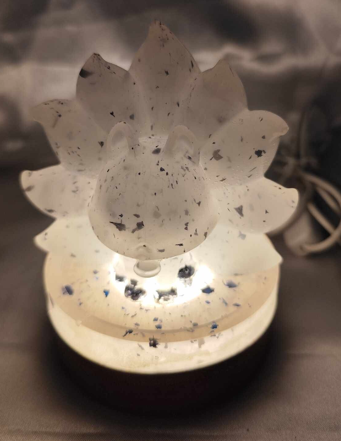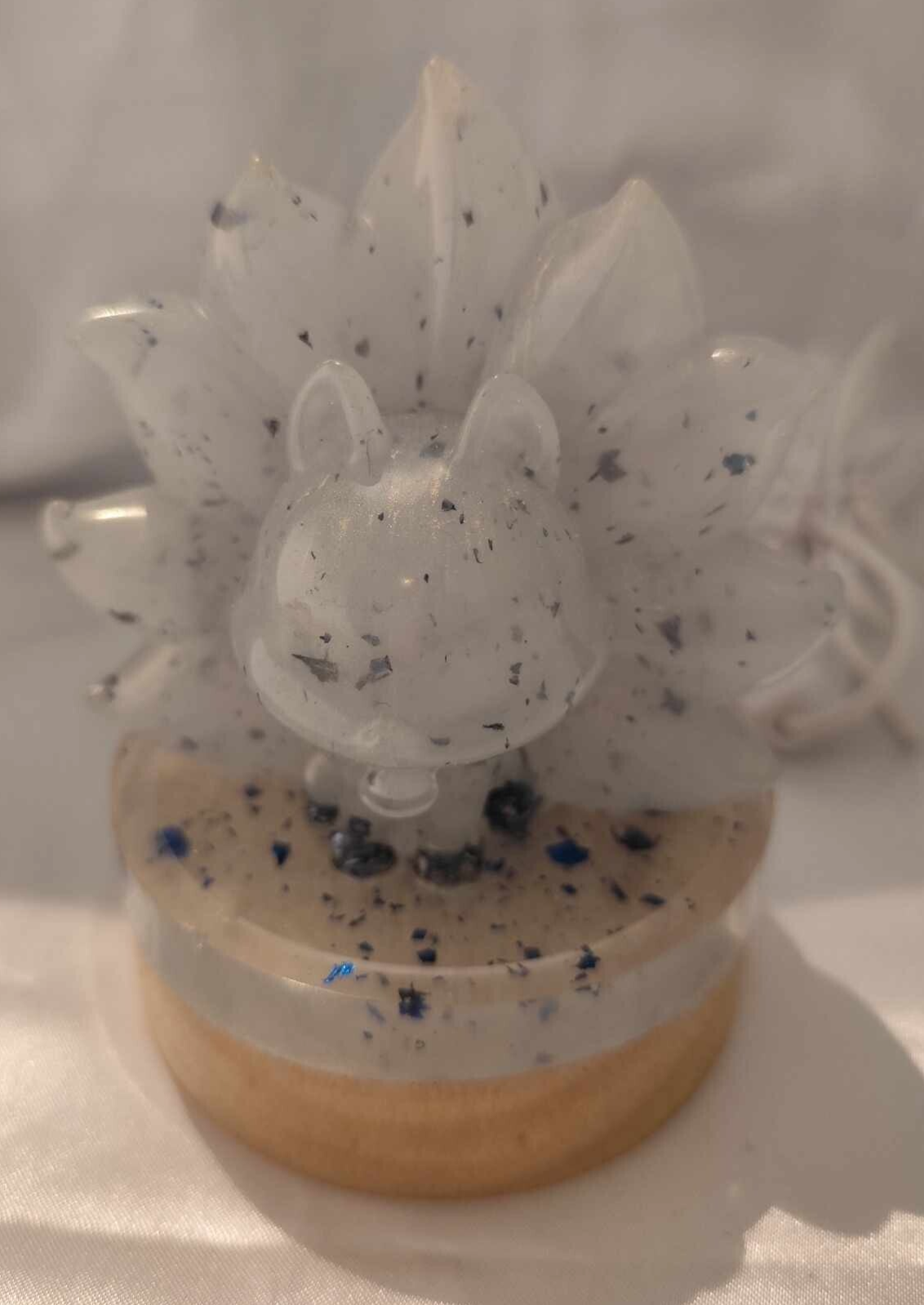 Ein süsser Neunschwänziger Fuchs als Lampe aus Epoxisharz auf einem LED Holzsockel. Die Lampe hat ein angenehmes warmes Licht.
