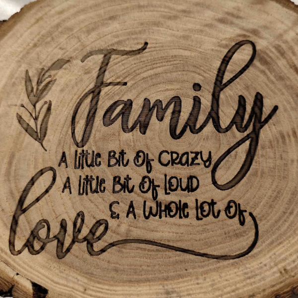 Eine schöne Dekoscheibe mit Text "Family A little bit of Crazy a little bit of Loud & a whole lot of Love" was übersetzt heiss " Familie Ein bisschen verückt ein bisschen laut und eine Menge Liebe" Die Scheibe kann gelegt oder gestellt werden. Auf Wunsch können wir diese gerne auch zum Aufhänken machen.