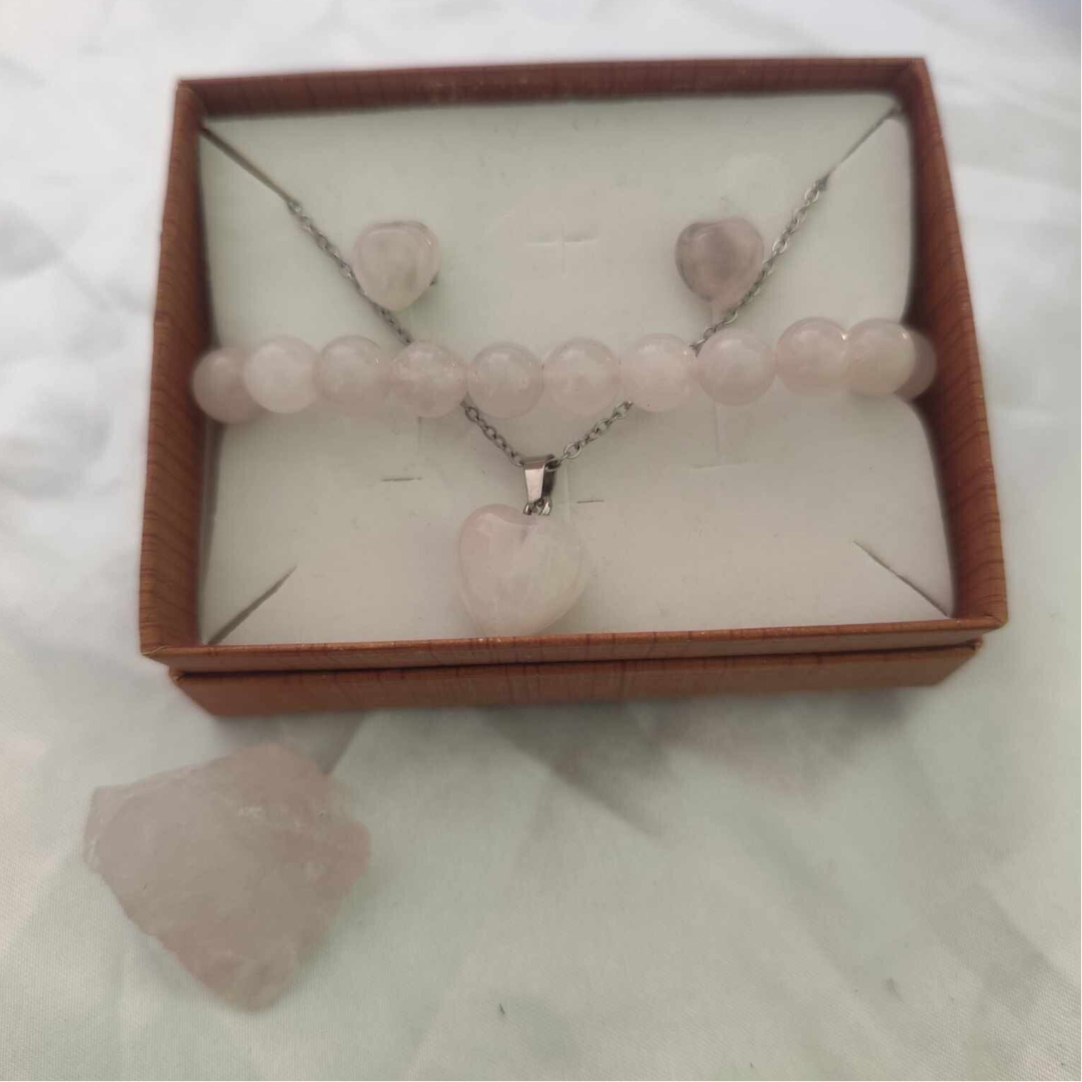 Ein schönes Schmuckset aus Rosenquarz. Das Set besteht aus einem Paar Ohrstecker, einer Halskette, einem Armband sowie einem kleinen Rosenquarz zum aufstellen oder bei sich zu tragen.