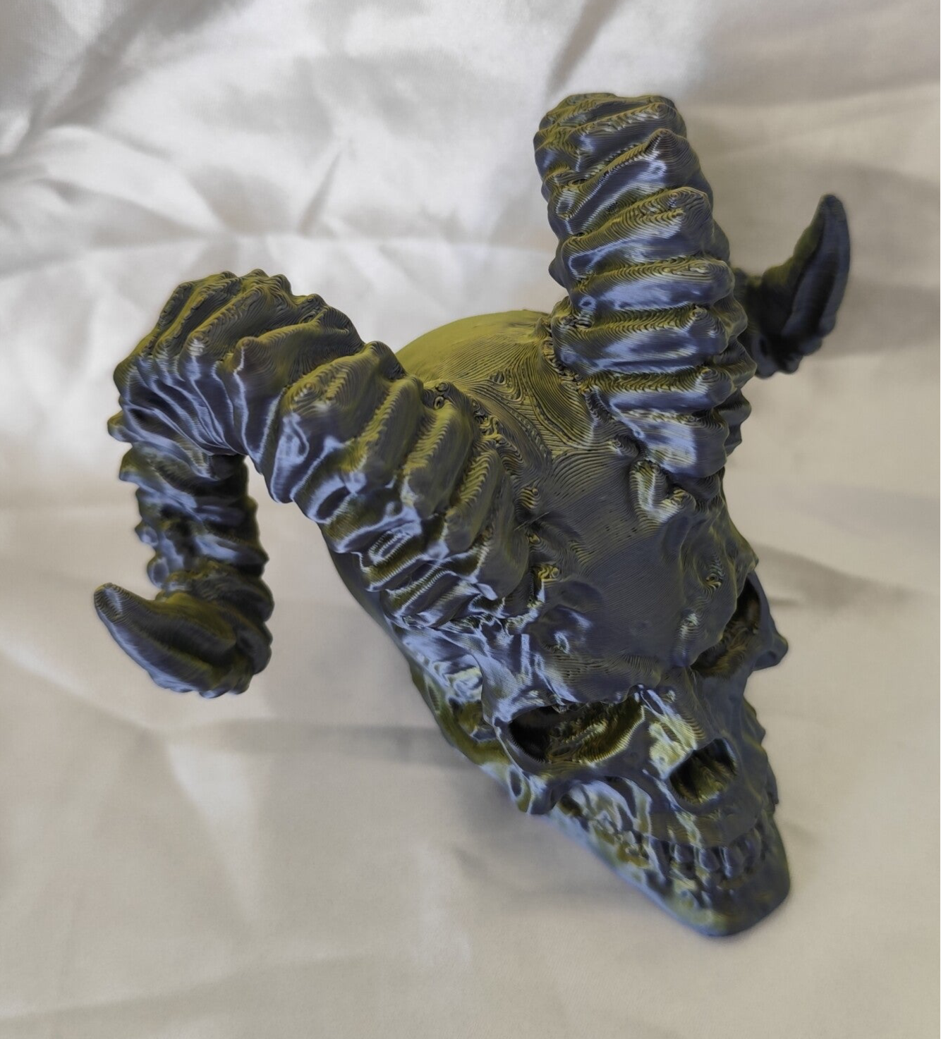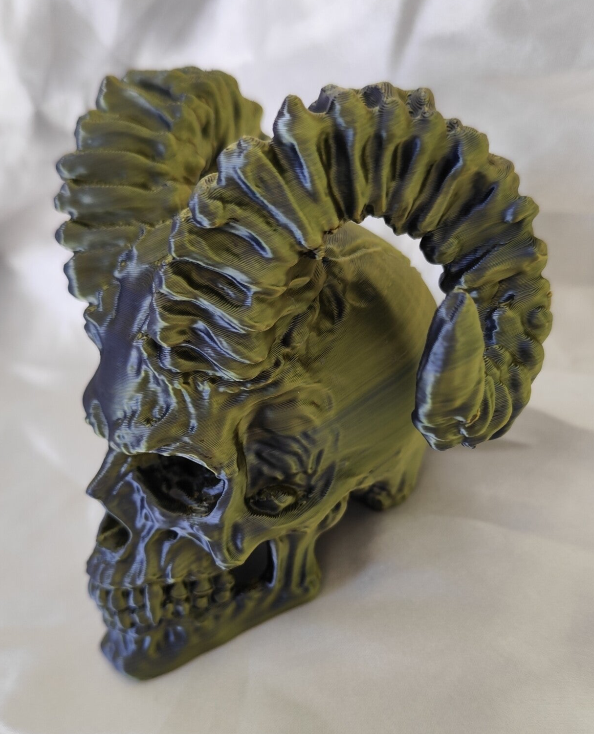 Ein gehörnter Totenkopf in einem tollen Schwarz & Gold. Dieses Dekostück ist der Hingucker. Je nach Blickwinkel wechselt die Farbe von schwarz zu Gold.