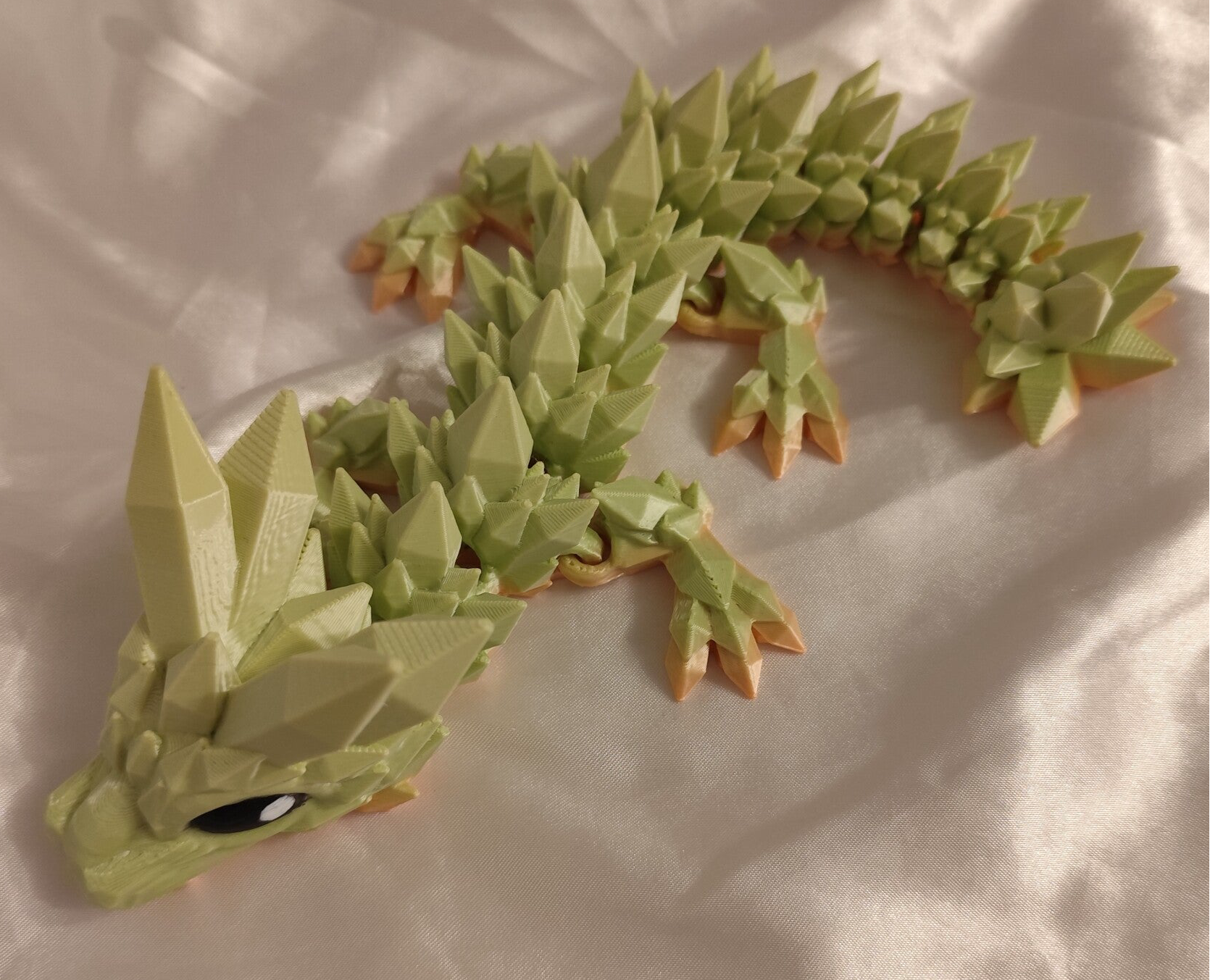 Ein cooler Kristall Drache. Gedruckt wurde dieser in einem tollen Silk Filament das einen schönen Grün & Orange Verlauf hat.